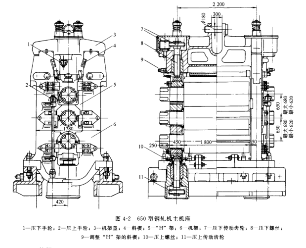 圖4-2所示為650型鋼軋機(jī)主機(jī)座,主機(jī)座中上,中,下三個軋輥旋轉(zhuǎn)方向固定不變,在中下輥之間交替過鋼,實現(xiàn)多道次往復(fù)軋制。中輥位置固定,上下輥分別通過壓下裝置和壓上裝置進(jìn)行徑向調(diào)整,以保證孔型的要求。壓上,壓下均采用手動裝置,軋輥在軋制過程中實不調(diào)整的,只有在換輥之后和軸瓦磨損時才進(jìn)行調(diào)整。上輥的調(diào)整量小,一般采用簡單的彈簧平衡。