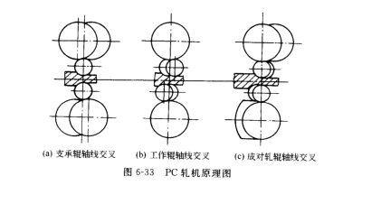 PC軋機(jī)基本上是一種四輥軋機(jī),與一般四輥軋機(jī)主要不同之處是將平行布置的軋輥改變交叉布置。在軋制過程中,當(dāng)離開中心的距離增大時(shí),gun風(fēng)也增大,一次來控制凸度,這與使工作輥凸度變化等效。就是說,PC軋機(jī)是利用調(diào)節(jié)軋輥軸線的交叉角度來控制凸度,是輥縫可調(diào),而工作輥又不至于產(chǎn)生撓度。因此,凸度控制不會(huì)永祥工作輥的強(qiáng)度和剛度。軋輥軸線交叉布置可以有三種形式(見圖6-33):支撐輥軸線交叉布置:工作輥軸線交叉布置和承兌軋輥軸線交叉布置等。只要改變交叉角,就能改變軋輥凸度。工作輥軸線交叉布置時(shí),軋輥凸度變化范圍較大,但是這種布置形式的軋機(jī)未能的到實(shí)際應(yīng)用。因?yàn)檫@種形式布置的軋機(jī),在公祖哦gun和支撐輥之間產(chǎn)生較大的相對(duì)滑動(dòng),使軋輥磨損和能量消耗大為增加。當(dāng)支撐輥軸線交叉布置時(shí),其效果同工作輥軸線交叉布置時(shí)一樣,在工作輥和支撐輥之間同樣產(chǎn)生相對(duì)滑動(dòng),使軋輥磨損和能量消耗大為增加。當(dāng)軋輥軸線承兌交叉布置時(shí),工作輥和支撐輥之間就不會(huì)產(chǎn)生相對(duì)滑動(dòng),這就消除了上述弊端,因此得到實(shí)際應(yīng)用的PC軋機(jī)即時(shí)采用“承兌交叉”布置的軋機(jī)。