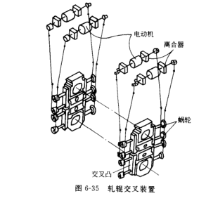 上、下交叉輥的傳動(dòng)裝置用電機(jī)驅(qū)動(dòng),調(diào)整工作輥和支承輥軸承座的交叉頭是由電動(dòng)機(jī)通過蝸輪減速機(jī)同時(shí)驅(qū)動(dòng)的。當(dāng)軋輥軸承座間隙過大時(shí),交叉頭之間的擴(kuò)大和縮小的微調(diào)是通過四臺(tái)電動(dòng)機(jī)和八個(gè)離合器來完成的。