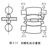 四輥軋機(jī)工作輾的撓度如圖 6-17 所示。由于在工作輥與支承輥的接觸壓扁上存在著有害的 A 區(qū),即大于軋制帶材寬度的工作輥與支承輥的接觸區(qū),因此,在 A接觸區(qū)的接觸應(yīng)力形成一個(gè)使軋輾撓度加大的有害彎矩。這樣工作輥的撓度不僅取決于軋制力,而且也取決于軋制帶鋼的寬度,即接觸區(qū) A 的寬度。當(dāng)軋制帶材寬度在較大范圍內(nèi)變化時(shí),工作輥上由于彈性壓扁不均引起的撓度變化就很大,且反彎作用要被有害彎矩抵消一部分。